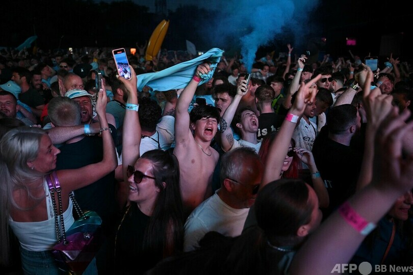 【6月11日 AFP】サッカー欧州チャンピオンズリーグ(UEFA Champions League 2022-23)決勝のマンチェスター・シティ(Manchester City)対インテル(Inter Milan)戦が行われた10日、英マンチェスターではパブリックビューイングが開催され、シティのサポーターはクラブ史上初の欧州制覇に沸いた。(c)AFP