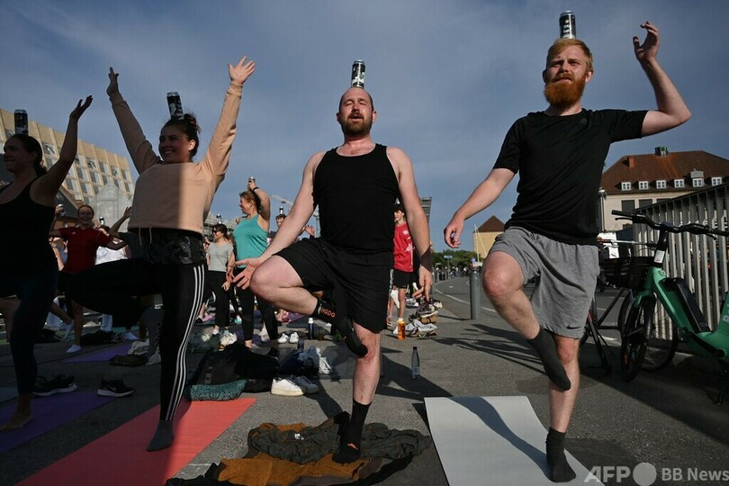 【6月18日 AFP】デンマーク・コペンハーゲンで開かれた「ビア・ヨガ(Beer Yoga)」に参加し、缶ビールに手を伸ばす女性。