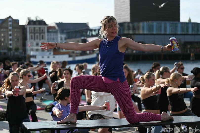 【6月18日 AFP】デンマーク・コペンハーゲンで開かれた「ビア・ヨガ(Beer Yoga)」に参加し、缶ビールに手を伸ばす女性。
