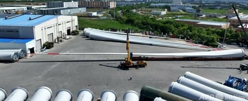 長さ123メートルの超大型ブレード3枚は30キロ離れた連雲港のふ頭に運ばれてから、海上輸送によって南東部の福建省付近の外洋にある洋上風力発電施設に運ばれます。15日前後には取りつけ作業が始まる予定です。(c)CGTN Japanese/AFPBB News
