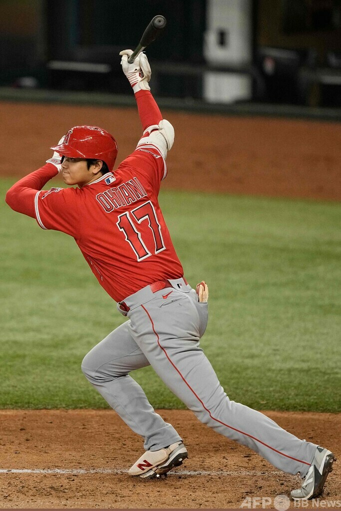 大谷は9回に左中間へ今季21号の2ランを放ち、ア・リーグの本塁打王争いでニューヨーク・ヤンキース(New York Yankees)のアーロン・ジャッジ(Aaron Judge)に2本差をつけた。この日は4打数2安打2打点1四球だった。試合はエンゼルスが3-6で敗れた。(c)AFP