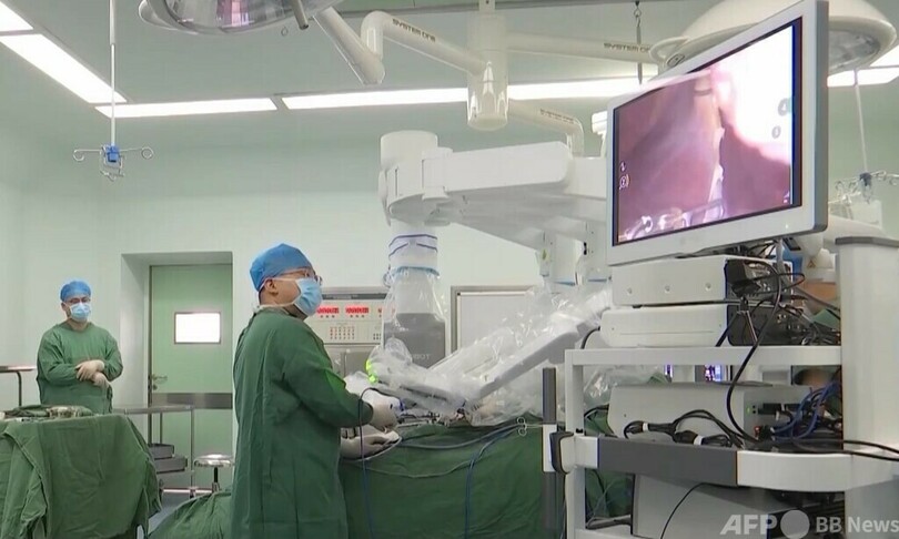 手術に用いられたのは、5G技術によって超遠隔手術を実施する内視鏡を取り付けた4本のロボットアームです。コアソフトウエアとハードウエアは全て中国の自主開発によるものです。(c)CGTN Japanese/AFPBB News