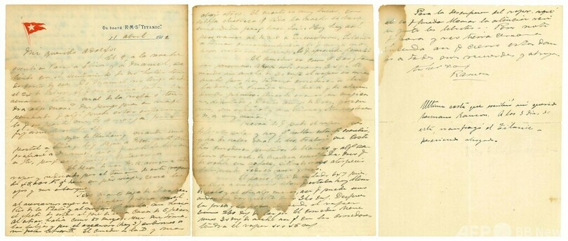 【6月21日 AFP】ウルグアイの首都モンテビデオで30日、北大西洋で沈没した豪華客船タイタニック号(RMS Titanic)に乗っていたウルグアイ人実業家が書いた手紙が、競売にかけられる。開始価格は1万2000ドル(約170万円)、落札予想価格は1万5000~2万5000ドル(約210万~約350万円)。競売会社ソリリャ(Zorrilla)が明らかにした。