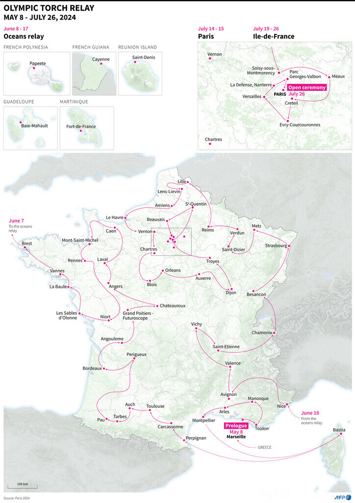 【6月24日 AFP】(更新)2024年パリ五輪・パラリンピックの組織委員会は23日、五輪聖火リレーのルートを発表した。80日間かけて世界遺産のモンサンミシェル(Mont Saint-Michel)や、カリブ海(Caribbean Sea)などの海外県、ベルサイユ宮殿(Chateau de Versailles)をめぐる予定で、組織委のトニー・エスタンゲ(Tony Estanguet)会長は「とてつもなく、信じられない」ルートだとし、「1年半にわたる莫大なチームワークの結果だ」と称賛している。