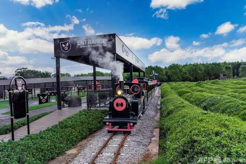浙江省金華市にあるこの「養豚場ホテル」は「熊猫猪(パンダ豚)国際牧場」内にあり、養豚場は城の形をしていて、花園と茶園に囲まれ、至る所で花と茶の香りがします。来場者はコーヒーを飲みながら、ガラス越しにパンダ豚の妊娠から哺乳、保育、肥育までの養殖の全過程を鑑賞できます。スマート養殖観光、科学教育普及、親子旅行、レジャー娯楽の総合的観光スポットとなり、人気を呼んでいます。(c)CGTN Japanese/AFPBB News