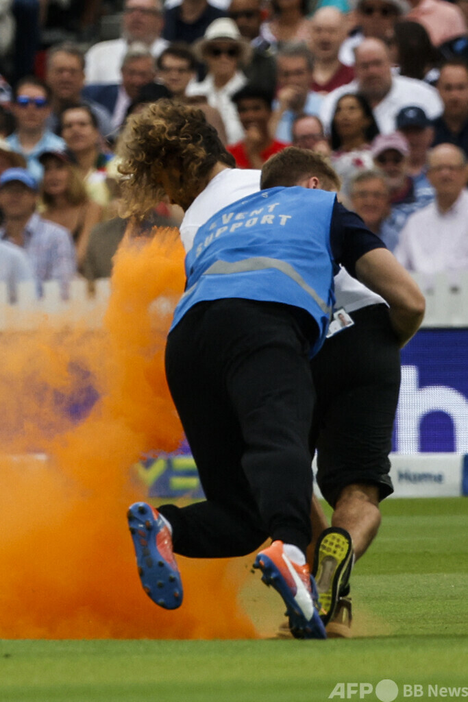 【6月29日 AFP】28日に英ロンドンで行われたクリケットのイングランド対オーストラリア戦で、環境団体「ジャスト・ストップ・オイル(Just Stop Oil)」の活動家2人がピッチに侵入し、試合が一時中断した。うち1人はイングランドのジョニー・ベアストウ(Jonny Bairstow)に捕まり、フィールドの外に運び出された。