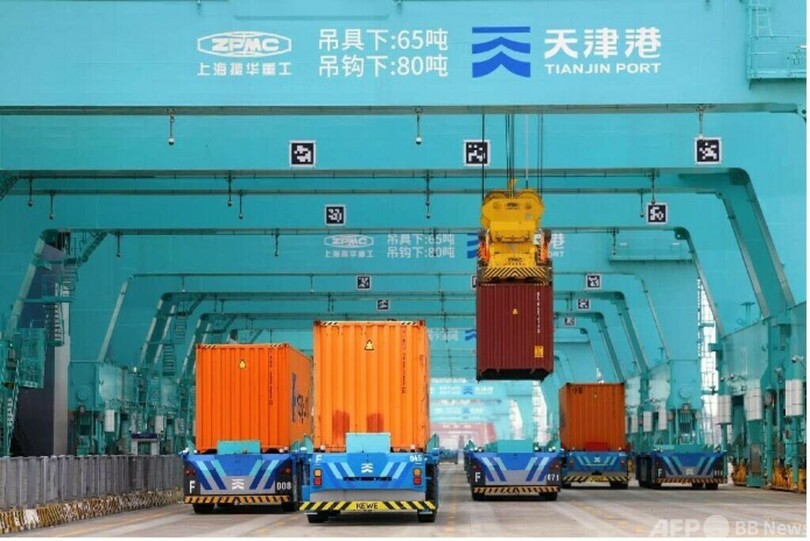 天津(Tianjin)港北疆港区C区スマートコンテナふ頭では、12台の自動ガントリークレーンが世界から来た巨大船からコンテナを効率的に積み下ろししている。92台のスマート水平輸送ロボットが往来し、42台の自動コンテナクレーンがさまざまな動きをしている。人の姿は見えない。ふ頭の北側では風力発電機2基が潮風を受けて穏やかに回転しており、ふ頭に電力を絶え間なく送っている。