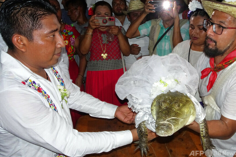 【7月2日 AFP】メキシコ南部の町サンペドロウアメルラ(San Pedro Huamelula)で、町長とワニの聖なる「結婚式」が行われた。地元住民に幸運をもたらす伝統行事だという。