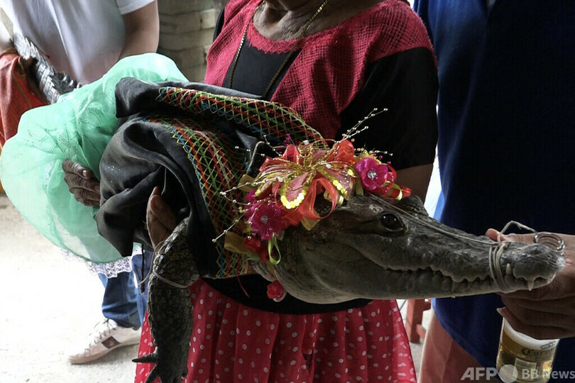 【7月2日 AFP】メキシコ南部の町サンペドロウアメルラ(San Pedro Huamelula)で、町長とワニの聖なる「結婚式」が行われた。地元住民に幸運をもたらす伝統行事だという。