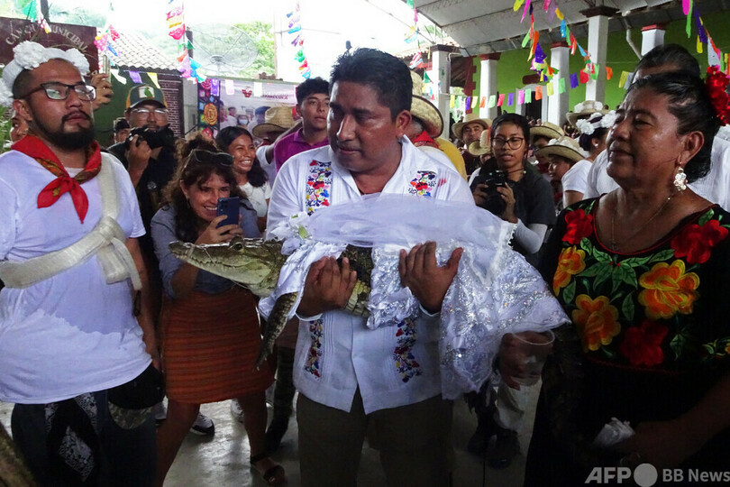 【7月2日 AFP】メキシコ南部の町サンペドロウアメルラ(San Pedro Huamelula)で、町長とワニの聖なる「結婚式」が行われた。地元住民に幸運をもたらす伝統行事だという。