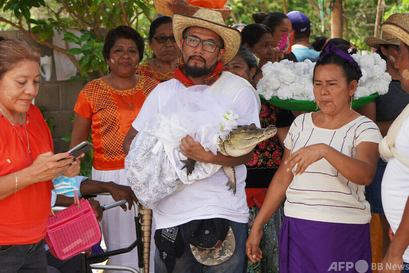 【7月2日 AFP】メキシコ南部の町サンペドロウアメルラ(San Pedro Huamelula)で、町長とワニの聖なる「結婚式」が行われた。地元住民に幸運をもたらす伝統行事だという。