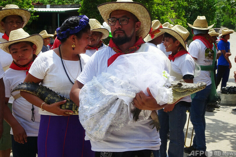 【7月2日 AFP】メキシコ南部の町サンペドロウアメルラ(San Pedro Huamelula)で、町長とワニの聖なる「結婚式」が行われた。地元住民に幸運をもたらす伝統行事だという。