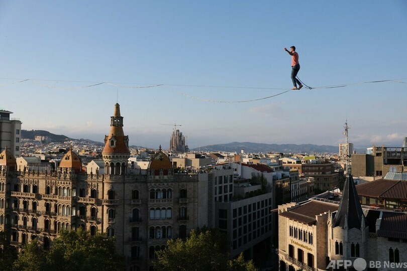【7月3日 AFP】スペイン・バルセロナ(Barcelona)で2日、フランス人のナタン・ポラン(Nathan Paulin)さんが、細いベルトの上を歩くスラックラインに挑んだ。