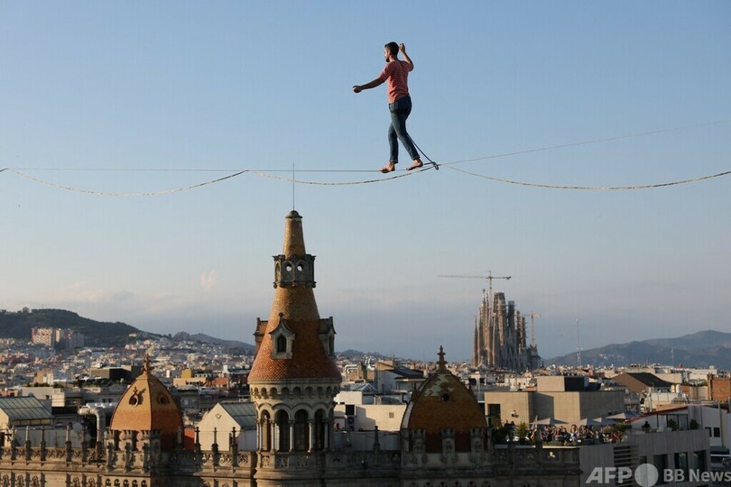 【7月3日 AFP】スペイン・バルセロナ(Barcelona)で2日、フランス人のナタン・ポラン(Nathan Paulin)さんが、細いベルトの上を歩くスラックラインに挑んだ。