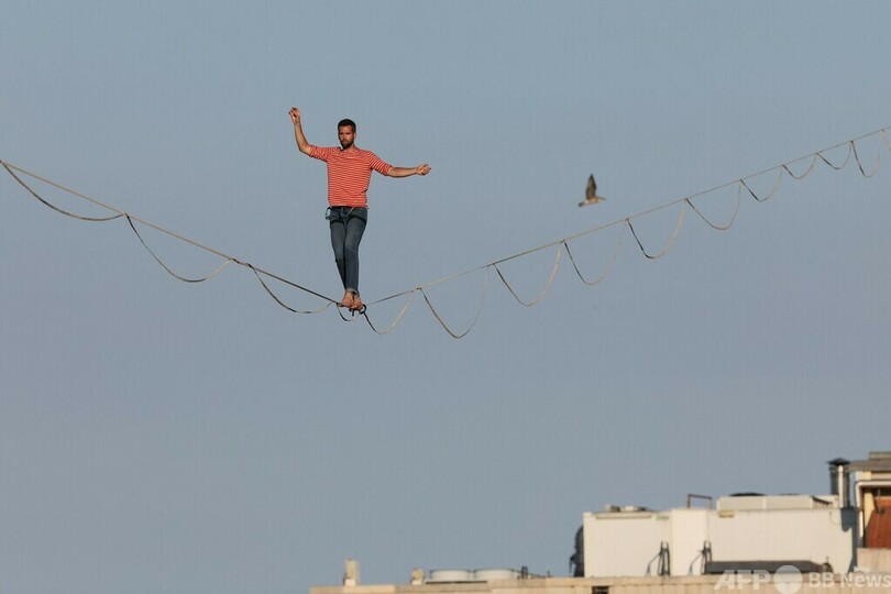 【7月3日 AFP】スペイン・バルセロナ(Barcelona)で2日、フランス人のナタン・ポラン(Nathan Paulin)さんが、細いベルトの上を歩くスラックラインに挑んだ。