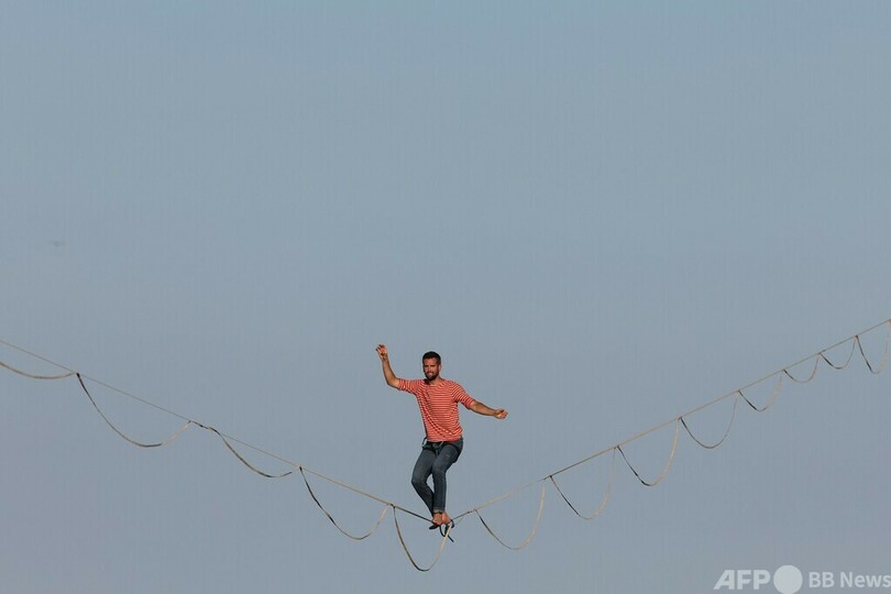 【7月3日 AFP】スペイン・バルセロナ(Barcelona)で2日、フランス人のナタン・ポラン(Nathan Paulin)さんが、細いベルトの上を歩くスラックラインに挑んだ。