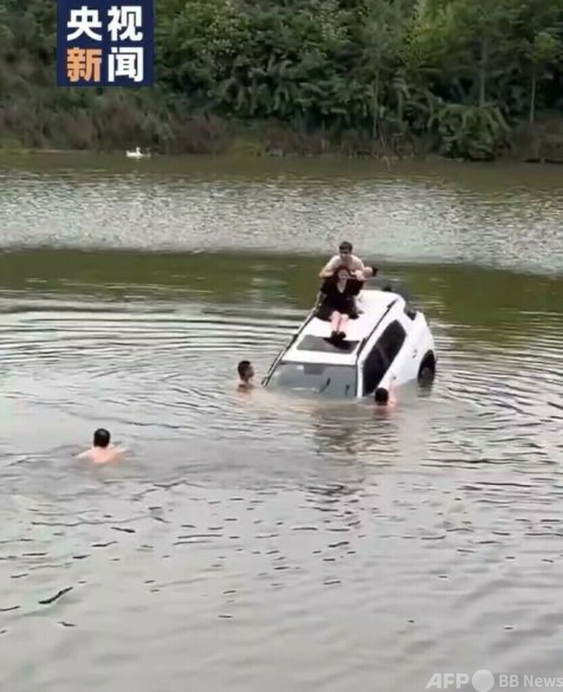車が池に転落 中国の退役軍人が家族3人を救出