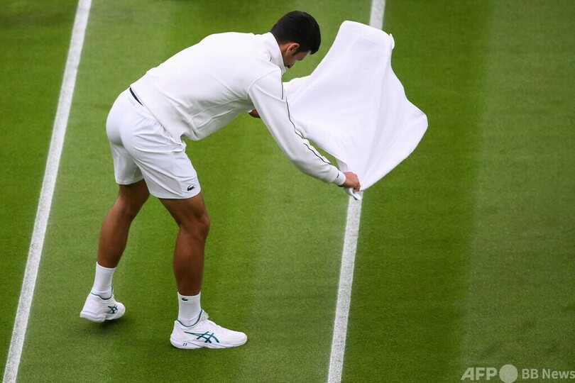ジョコビッチ初戦突破、タオルで芝乾かすジョークも ウィンブルドン