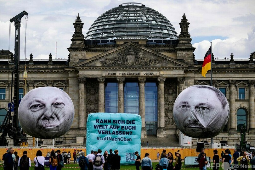 ドイツ連邦議会(下院)の議場が置かれている国会議事堂の前では、オラフ・ショルツ(Olaf Scholz)首相やクリスティアン・リントナー(Christian Lindner)財務相の顔が描かれた巨大な風船が浮かべられた。(c)AFP