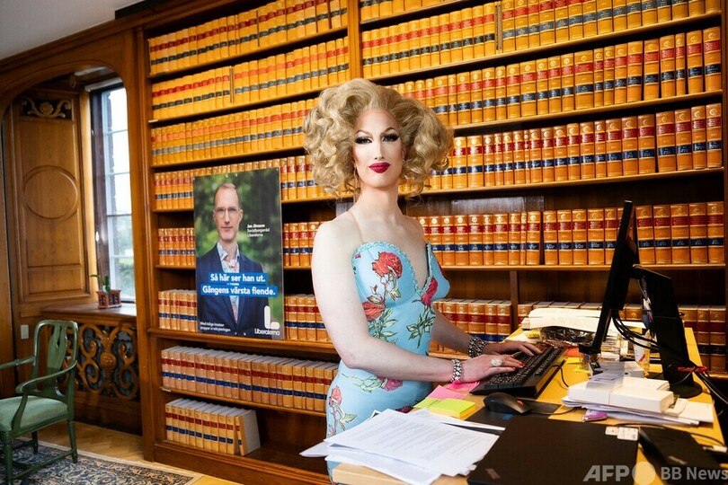 これに対し、中道右派・自由党のヨンソン氏は、自らドラァグクイーンに扮(ふん)する行動に出た。