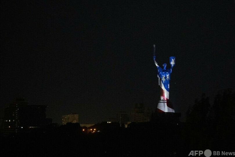 【7月5日 AFP】ウクライナの首都キーウ市内で4日、巨大な女神像が米国の国旗色にライトアップされた。同国の独立記念日に合わせたもの。