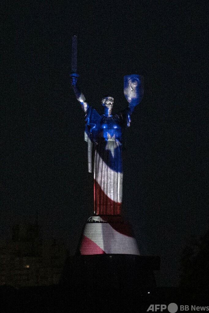【7月5日 AFP】ウクライナの首都キーウ市内で4日、巨大な女神像が米国の国旗色にライトアップされた。同国の独立記念日に合わせたもの。