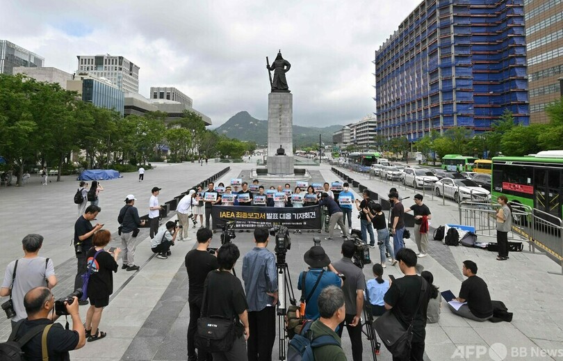【7月5日 AFP】韓国・ソウルの光化門広場(Gwanghwamun Plaza)で5日、東京電力(TEPCO)福島第1原子力発電所の処理水の海洋放出計画について、国際原子力機関(IAEA)が国際的な安全基準に合致しているとの報告書を出したことに抗議するデモが行われた。
