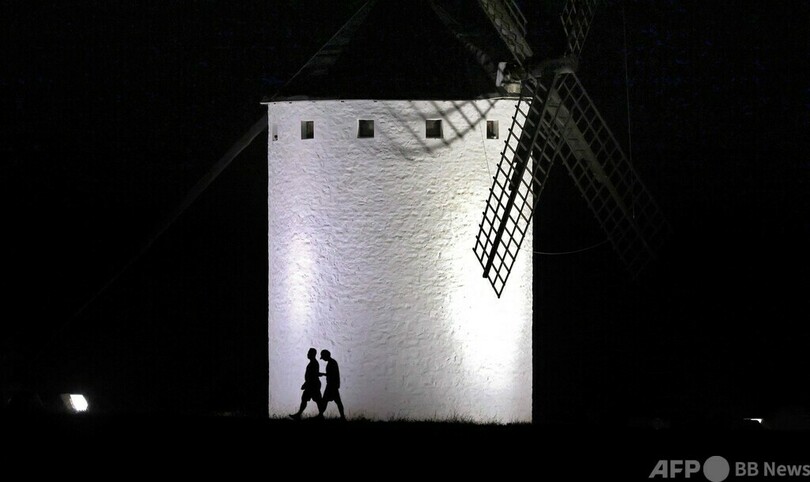 【7月14日 AFP】スペイン中部カスティーリャ・ラ・マンチャ(Castilla La Mancha)州のカンポ・デ・クリプターナ(Campo de Criptana)村にある風車の前を歩く人。同州は17世紀に出版されたミゲル・デ・セルバンテス(Miguel de Cervantes)の小説「ドン・キホーテ(Don Quixote)」の舞台として知られ、小説では主人公のドン・キホーテが風車と戦う場面が描かれている。(c)AFP