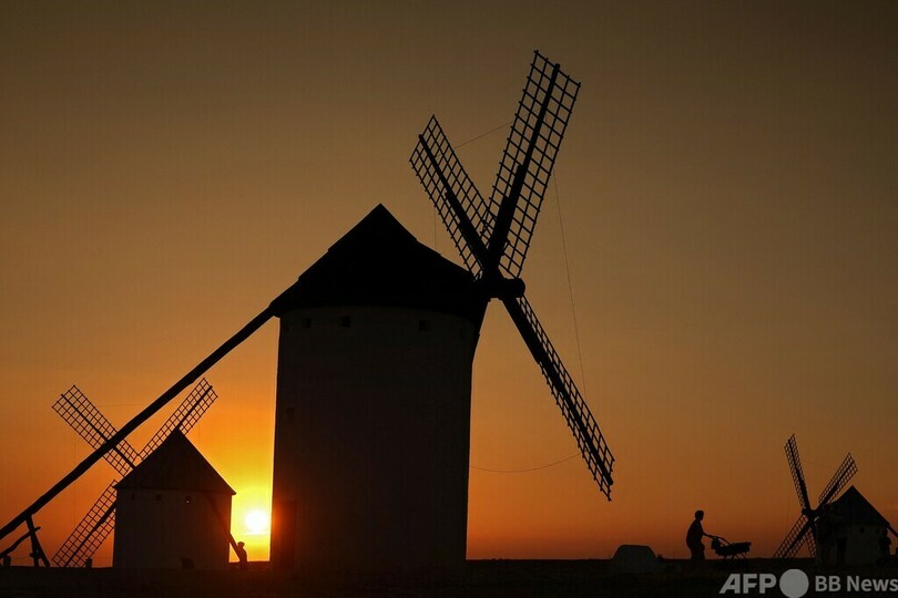 【7月14日 AFP】スペイン中部カスティーリャ・ラ・マンチャ(Castilla La Mancha)州のカンポ・デ・クリプターナ(Campo de Criptana)村にある風車の前を歩く人。同州は17世紀に出版されたミゲル・デ・セルバンテス(Miguel de Cervantes)の小説「ドン・キホーテ(Don Quixote)」の舞台として知られ、小説では主人公のドン・キホーテが風車と戦う場面が描かれている。(c)AFP