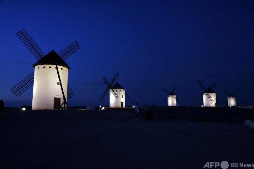 【7月14日 AFP】スペイン中部カスティーリャ・ラ・マンチャ(Castilla La Mancha)州のカンポ・デ・クリプターナ(Campo de Criptana)村にある風車の前を歩く人。同州は17世紀に出版されたミゲル・デ・セルバンテス(Miguel de Cervantes)の小説「ドン・キホーテ(Don Quixote)」の舞台として知られ、小説では主人公のドン・キホーテが風車と戦う場面が描かれている。(c)AFP