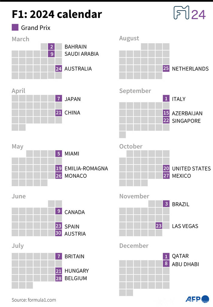 【7月6日 AFP】フォーミュラワン(F1、F1世界選手権)は5日、2024年シーズンの日程を発表し、過去最多の24戦を行うとした。