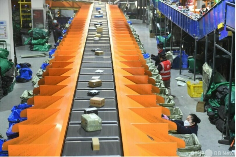 湖南省(Hunan)の瀏陽市(Liuyang)内にある宅配業者の韻達(Yunda Express)の配送センターでは、午前0時になっても作業が急ピッチで進められていた。仕分け作業は自動化されており、各地から運ばれてきた荷物が集荷袋の中に落ち、次の拠点に送られていく。