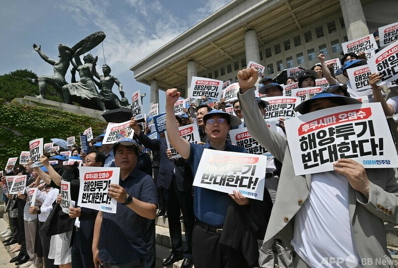 【7月8日 AFP】韓国の最大野党「共に民主党」の議員と党員は7日、ソウルの国会議事堂前で、東京電力(TEPCO)福島第1原子力発電所の処理水の海洋放出計画に対する抗議集会を実施し、「福島汚染水の海洋放出に反対」などと書かれたプラカードを掲げた。