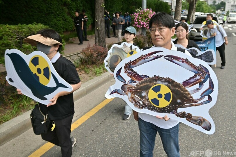 放出は今夏にも開始される見通しだが、一部の近隣諸国は反発。ソウルでは7日、最大野党「共に民主党」の議員と党員が抗議集会を実施し、「福島汚染水の海洋放出に反対」などと書かれたプラカードを掲げた。(c)AFP