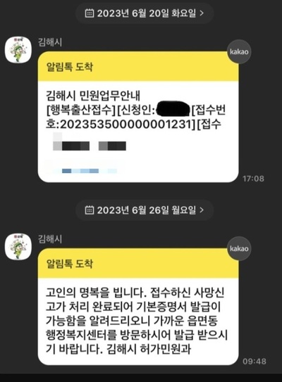 投稿によると、男性は先月17日に子どもを授かり、同月20日に出生届を出した。ところが26日午前9時48分ごろ、金海市から意外な内容のメッセージが送られてきた。「故人の冥福を祈ります。死亡届の受付手続きが完了し、基本証明書の発給が可能であることをお知らせしますので、近くの邑・面・洞の行政福祉センターで発給を受けてください」