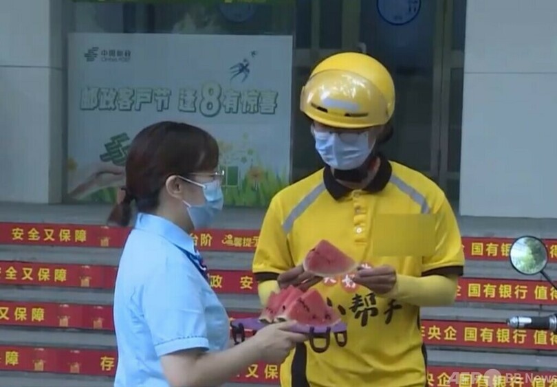 中国東部の山東省(Shandong)徳州市(Dezhou)では、納涼ステーションが設置されたほか、ボランティアが街や畑へ行き、屋外作業員に緑豆スープやスイカ、ミネラルウォーターなどの暑気払いの食品が届けられています。(c)CGTN Japanese/AFPBB News