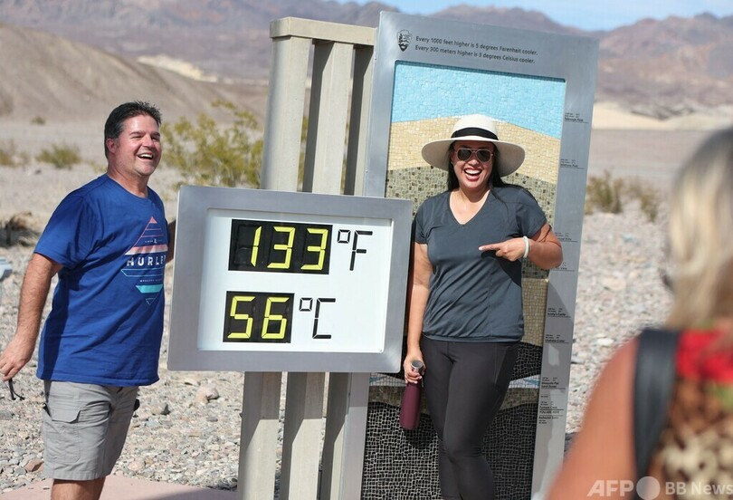 56度の文字も…温度計と笑顔で記念撮影 米デスバレー