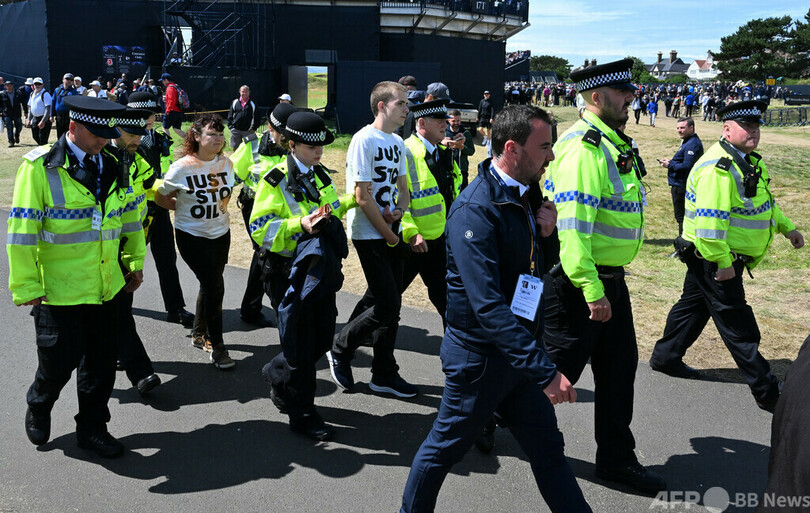 「ジャスト・ストップ・オイル」は、英ホイレイク(Hoylake)のロイヤルリバプールGC(Royal Liverpool Golf Club)で行われた大会2日目の17番ホールで抗議行動をしたことを認める声明を出した。警察も、この件で4人を逮捕したことを明らかにした。
