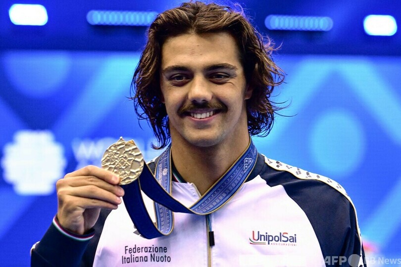 男子50メートルバタフライでは、イタリアのトマス・チェコン(Thomas Ceccon)が22秒68で金メダルを手にした。(c)AFP/Andrew MCKIRDY