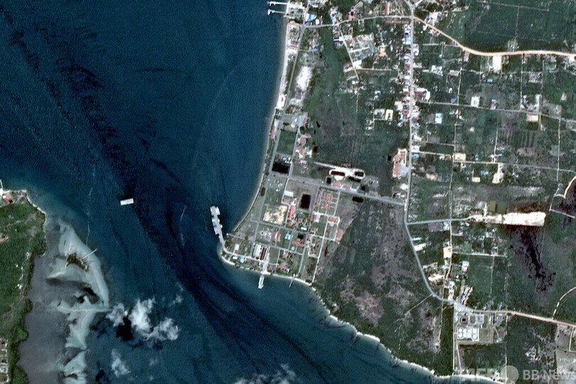 米民間衛星画像会社ブラックスカイ(BlackSky)が新たに公開した画像からは、リアム基地の建設工事が過去2年間に急速に進んだ様子が分かる。同社は専門家の画像分析により、現地には海に突き出した長さ363メートルの桟橋があるとしている。(c)AFP