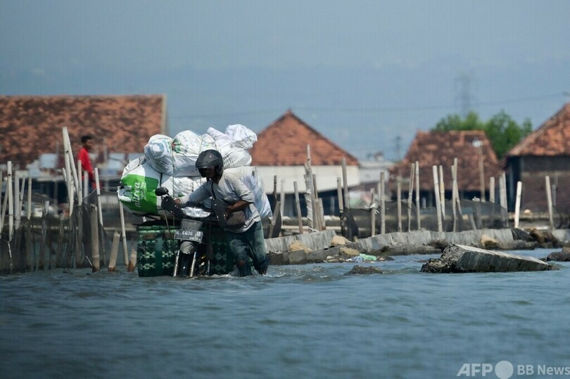 かつて青々とした水田が広がっていた土地には今、木製の遊歩道とカヌー用の水路が張り巡らされている。約200人が住む村は、島しょ国インドネシアの中でも海面上昇のペースが最も速い地域にある。