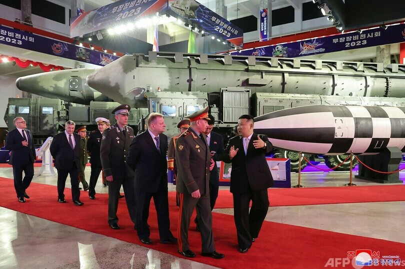 朝鮮中央通信(KCNA)は、「武装装備展示会」の会場でショイグ氏を案内する金氏の写真を公開した。会場にはICBM「火星17(Hwasong 17)」や「火星18(Hwasong 18)」も並んでいる。韓国ソウルに拠点を置く北朝鮮関連ニュースサイト「NKニュース(NK News)」によると、これまで未公開の無人機も展示されているという。