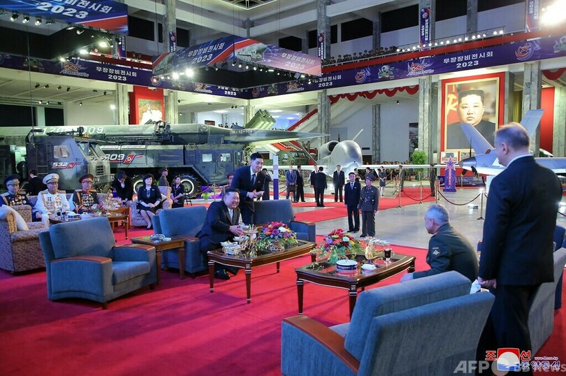 朝鮮中央通信(KCNA)は、「武装装備展示会」の会場でショイグ氏を案内する金氏の写真を公開した。会場にはICBM「火星17(Hwasong 17)」や「火星18(Hwasong 18)」も並んでいる。韓国ソウルに拠点を置く北朝鮮関連ニュースサイト「NKニュース(NK News)」によると、これまで未公開の無人機も展示されているという。