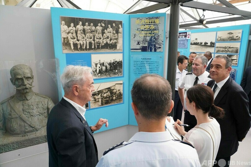 内倉浩昭(Hiroaki Uchikura)航空幕僚長、仏空軍トップのステファン・ミル(Stephane Mille)参謀長やフィリップ・セトン(Philippe Setton)駐日フランス大使も訪れた。(c)AFP