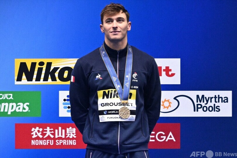 また、男子100メートルバタフライでは、フランスのマキシム・グルセ(Maxime Grousset)が優勝を飾っている。(c)AFP/Andrew MCKIRDY