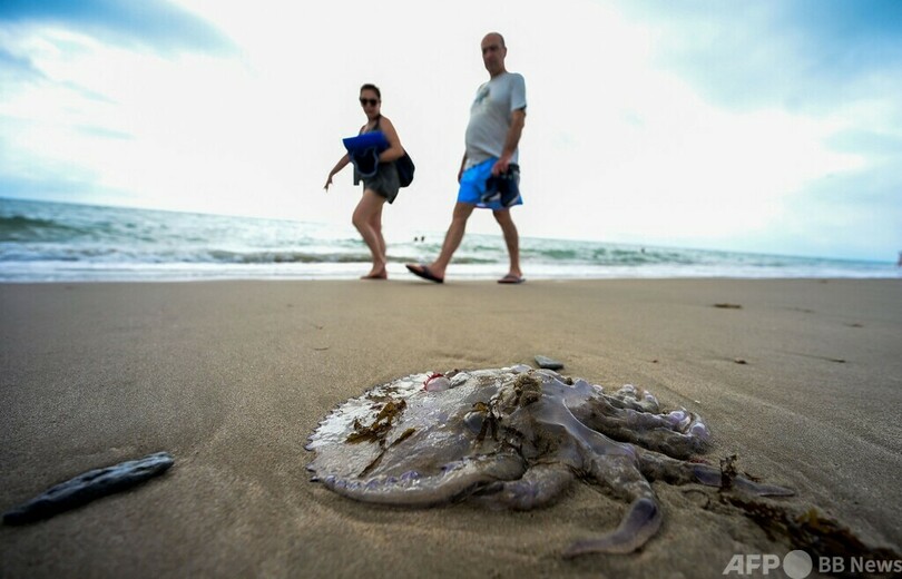【7月31日 AFP】地中海の水温が過去最高を記録する中、スペイン南東部バレンシア(Valencia)のピネド(Pinedo)の海岸にクラゲや藻類が漂着した。