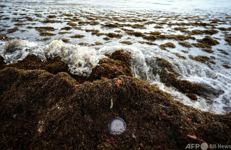 【7月31日 AFP】地中海の水温が過去最高を記録する中、スペイン南東部バレンシア(Valencia)のピネド(Pinedo)の海岸にクラゲや藻類が漂着した。