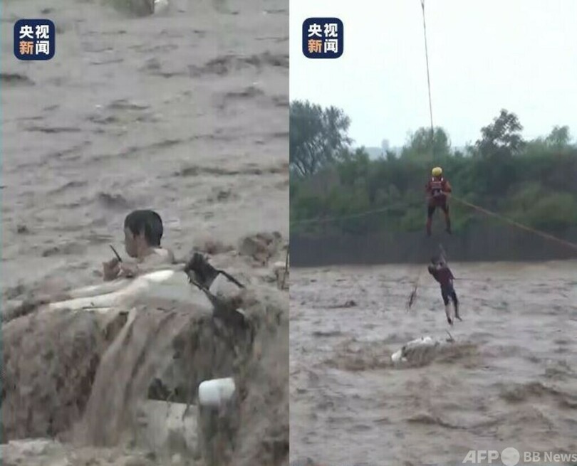 中国河北省で車ごと流された男性 消防士が「空から」救助