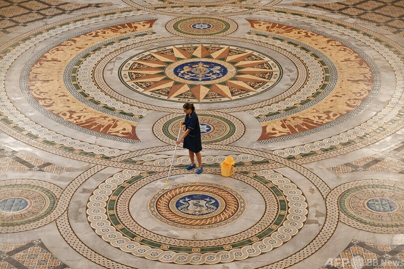 【8月13日 AFP】英北西部リバプールにある聖ジョージ・ホール(St George's Hall)のミントンタイル(Minton Tile)の床を掃除する市職員。