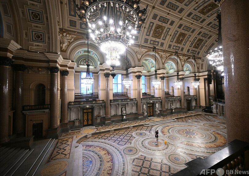 【8月13日 AFP】英北西部リバプールにある聖ジョージ・ホール(St George's Hall)のミントンタイル(Minton Tile)の床を掃除する市職員。